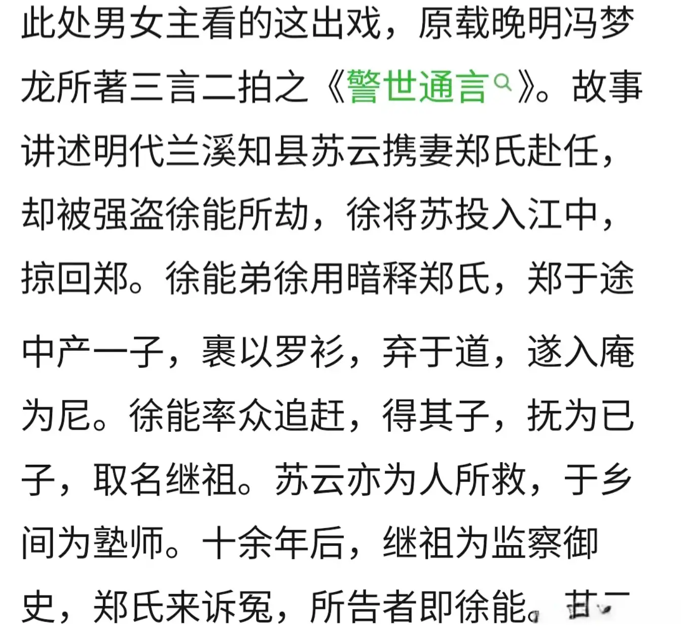 男女主在第二世开头,共同看了一出《罗衫记》。这出剧正是《警世通言》中的一段故事, 讲的是一门家眷,因当时闹倭寇,父为倭、子为官,亲情和公义难两全。