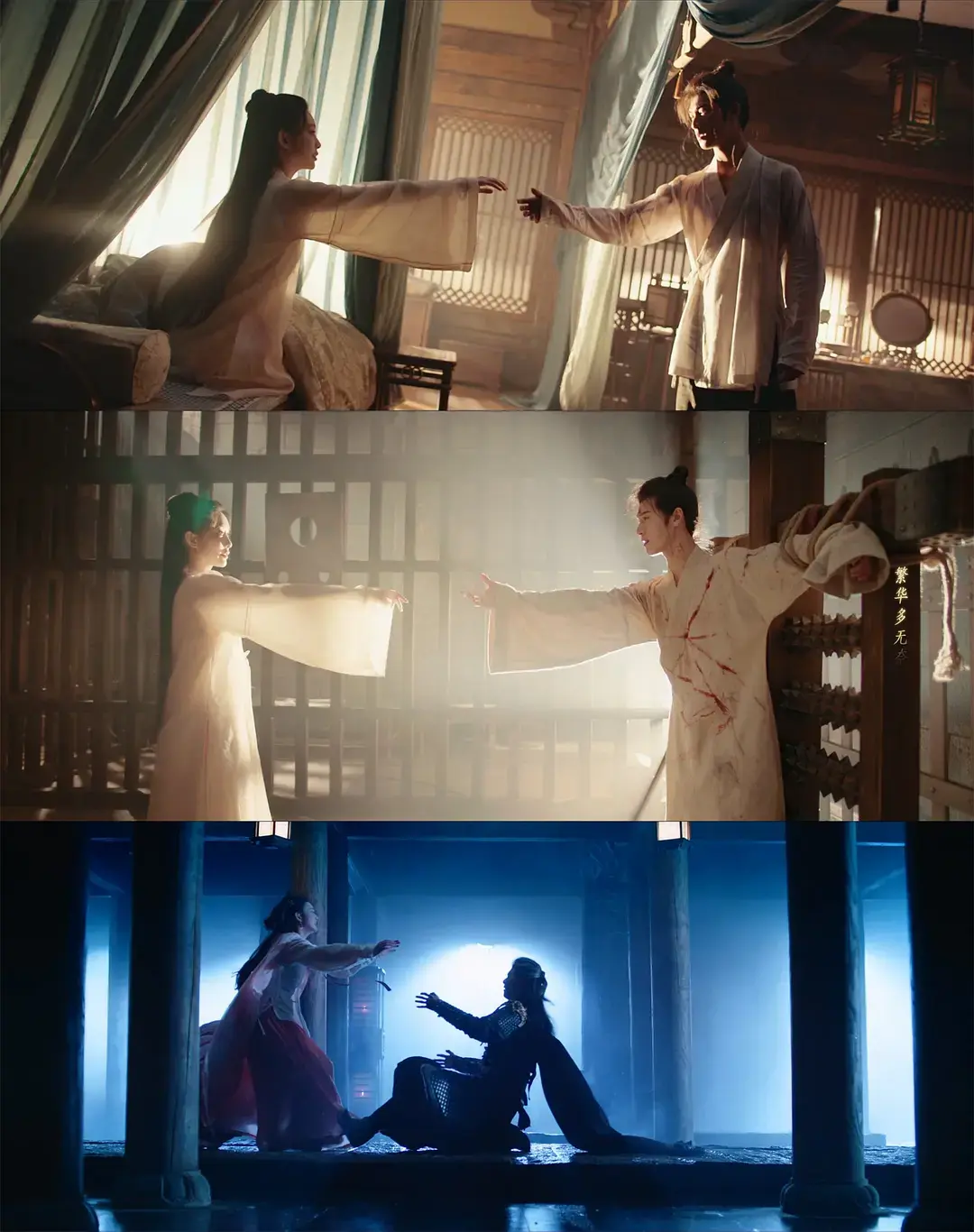这种虚实结合的手法还有一次,就是第二世宋墨和窦昭,同时面对濒死之际。二人的时空在那一瞬间再次交错,相互救赎,化箭为花。